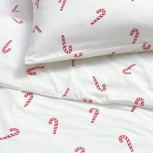 クリスマスを思わせる遊び心のあるキャンディケイン模様のベッドリネンセット。最近赤ちゃんが生まれたご家庭へのクリスマスギフトにぴったりです